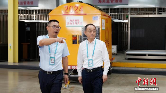 2025年11月12日,李国红(右)调研海口美兰国际机场封关运作项目。受访者供图