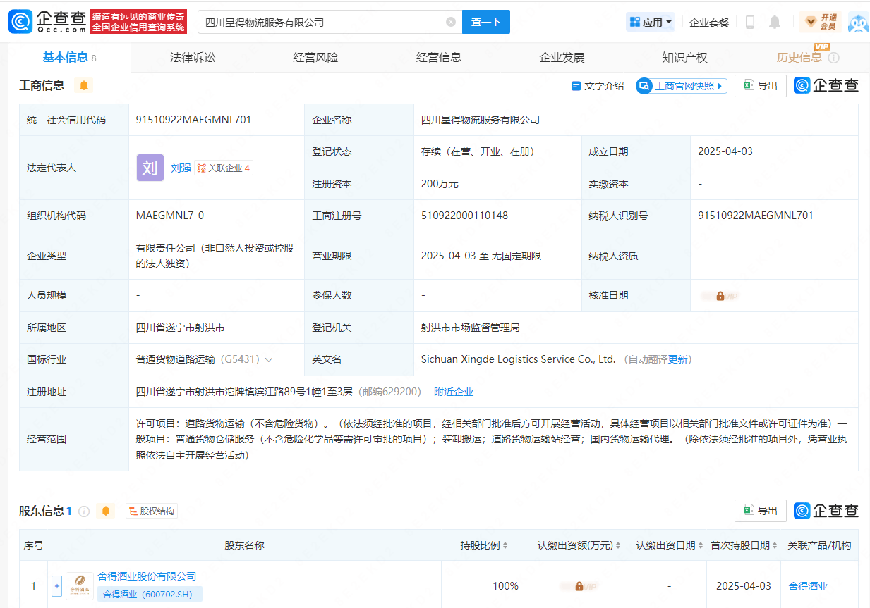 导读:企查查官网显示,近日,舍得酒业全资子公司四川星得物流服务有限公司正式成立。