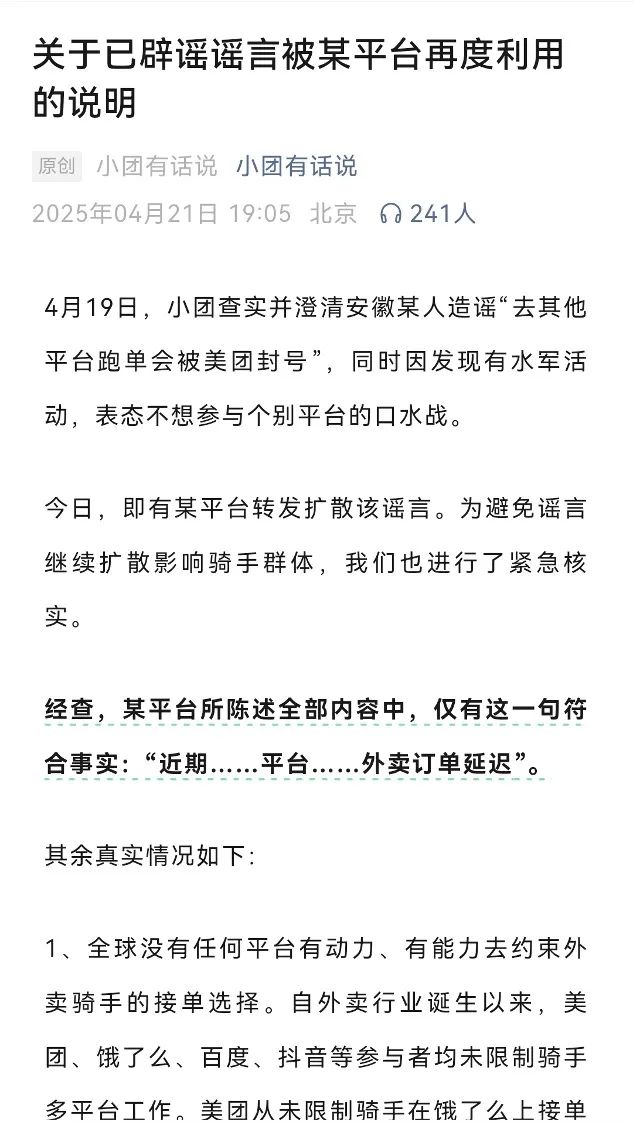 当日晚间,美团将矛头对准京东,回应称从未限制骑手在饿了么上接单,未要求骑手不跑闪送、顺丰等其他即时配送平台,同样更没有任何理由对某平台进行任何限制。