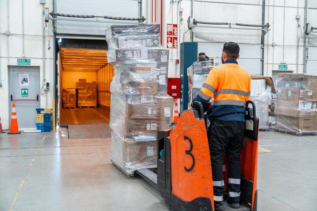 菜鸟马德里仓工作人员正在装运出库货物