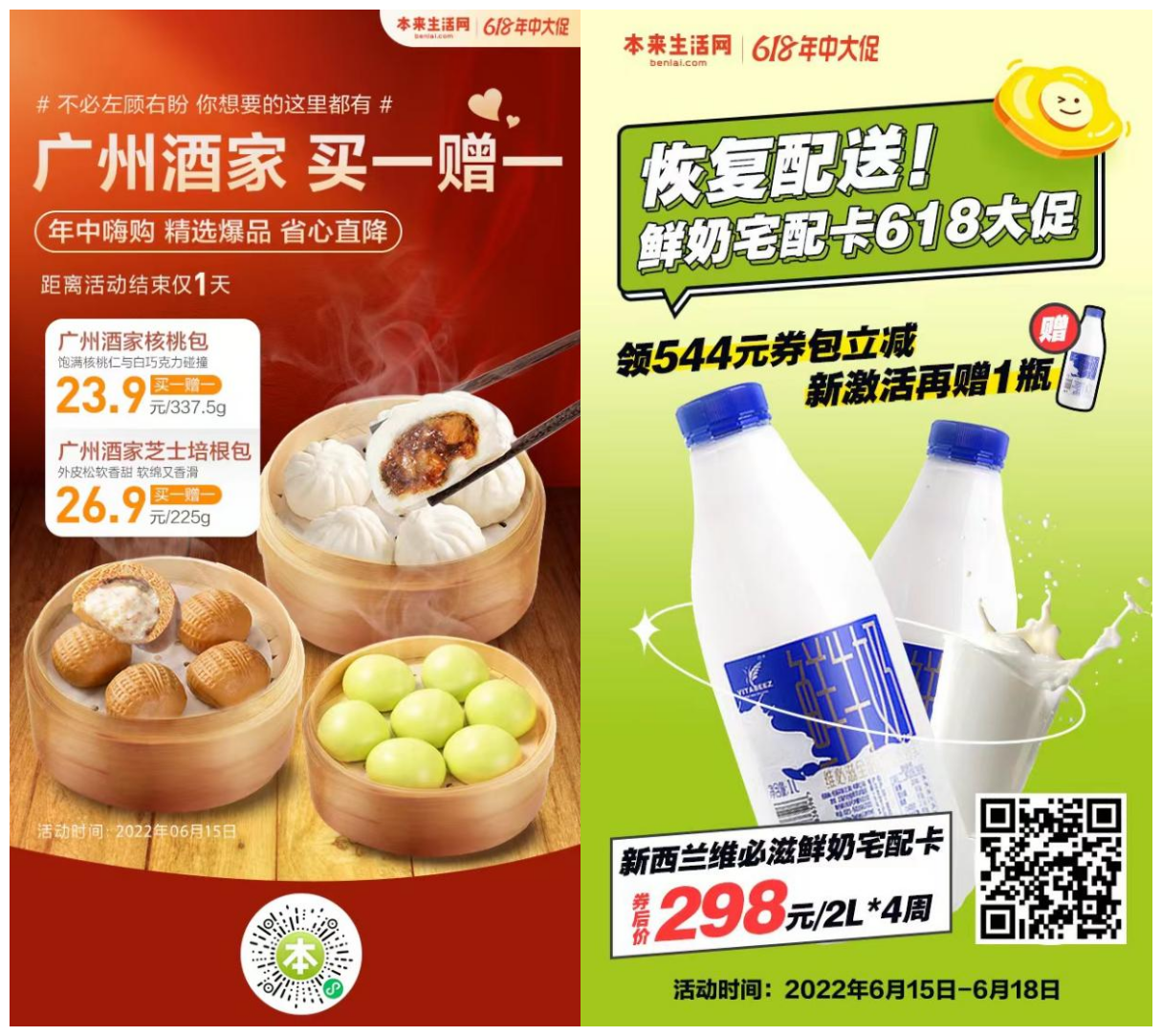 “我们618年中大促第一波复工专场的促销以品牌主打。这轮第二波促销全面升级,以明星商品为主、全场满减。习惯性采购的老用户会觉得很友好,可以凑多款不同品类的商品享受满减,优惠力度更大。”本来生活网运营人员介绍。