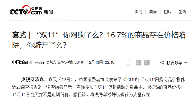 据央视新闻此前报道,中国消费者协会彼时发布的《2016年“双11”网购商品价格体验式调查报告》揭露,不少商品在11月11日当天并不是近期低价,消费者并没有得到实惠。在报告中,淘宝、京东、考拉海购等一众平台纷纷上榜。