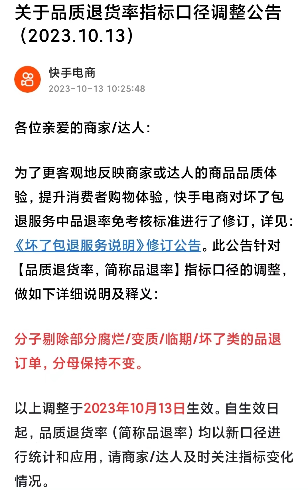 10月13日消息,快手电商关于品质退货率指标口径调整公告称,为了更客观地反映商家或达人的商品品质体验,提升消费者购物体验,快手电商对坏了包退服务中品退率免考核标准进行了修订。