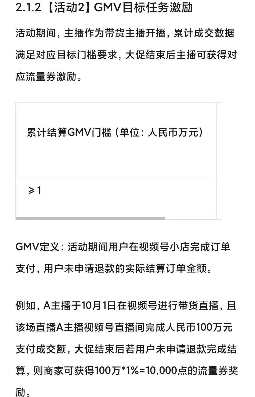GMV指活动期间用户在视频号小店完成订单支付,用户未申请退款的实际结算订单金额。例如,A主播于10月1日在视频号进行带货直播,且该场直播A主播视频号直播间完成人民币100万元支付成交额,大促结束后若用户未申请退款完成结算,则商家可获得100万*1%=10,000点的流量券奖励。