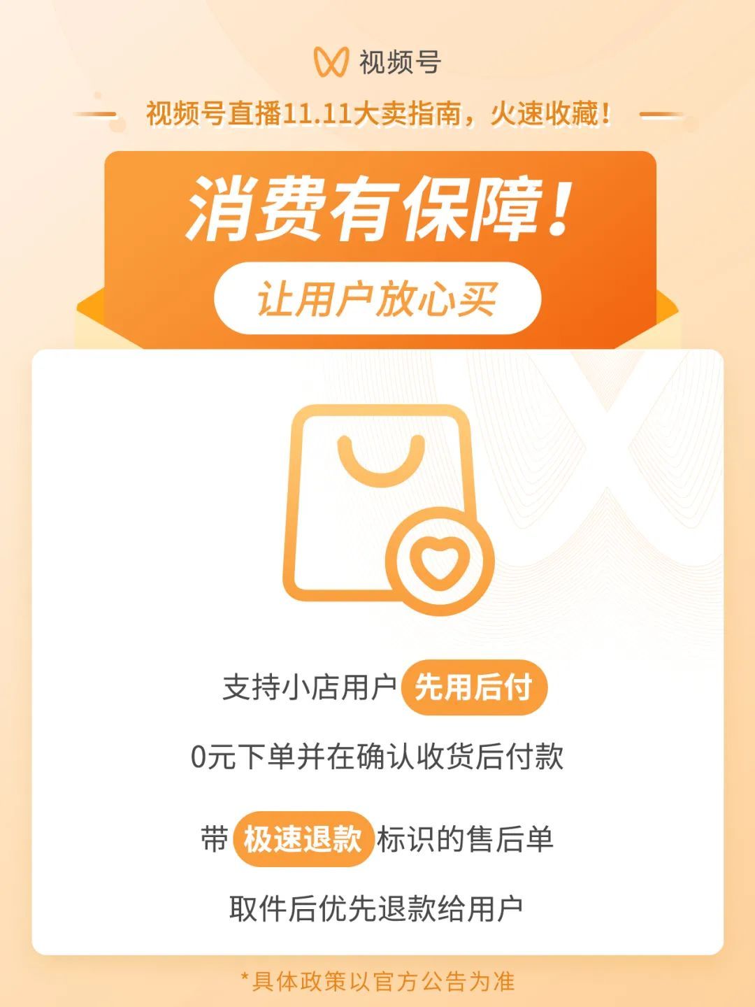 10月25日消息,视频号双11大促即将于10月31日20时启动。活动期间,平台内所有商家技术服务费率将降至1%,视频号小店运费险费率将根据商家类目下调12%-24%不等。此外,平台会对含运费险订单进行补贴,退货率低的商家可实现近0元投保。此外,视频号还将上线“极速退款”“先用后付”服务。