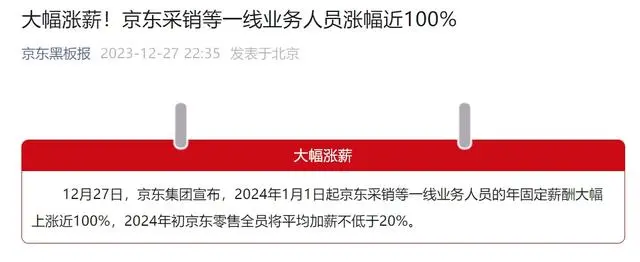 12月27日,京东集团宣布,2024年1月1日起京东采销等一线业务人员的年固定薪酬大幅上涨近100%,2024年初京东零售全员将平均加薪不低于20%。