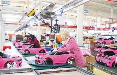 河北省邢台经济开发区近年来着力优化跨境贸易营商环境,推动外贸企业线上线下融合发展,开拓海外市场。图为日前,邢台市达力斯儿童玩具有限公司的工人加紧组装出口美国、德国的电动童车产品。