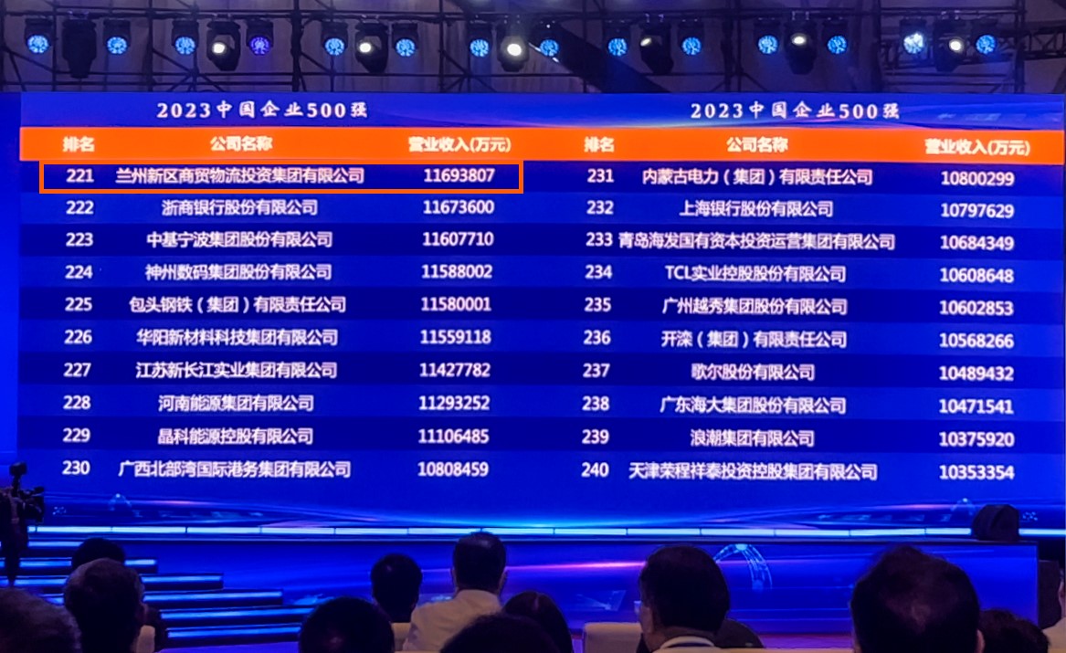 9月20日,中国企业联合会、中国企业家协会发布“2023中国企业500强”榜单,兰州新区商贸物流投资集团有限公司(以下简称“商投集团”)连续三年荣登“中国企业500强”。2023年以1169.38亿元的营业收入,位列“中国企业500强”第221位,位次较2022年度上升26位;同时位列“中国服务业企业500强”第75位,相较2022年度上升15位。