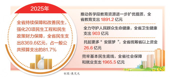 夯实民生之本,增进民生福祉。从河北省财政厅获悉,2025年,全省持续保障和改善民生,强化20项民生工程和民生政策财力保障,全省民生支出8369.6亿元,占一般公共预算支出的81.7%。