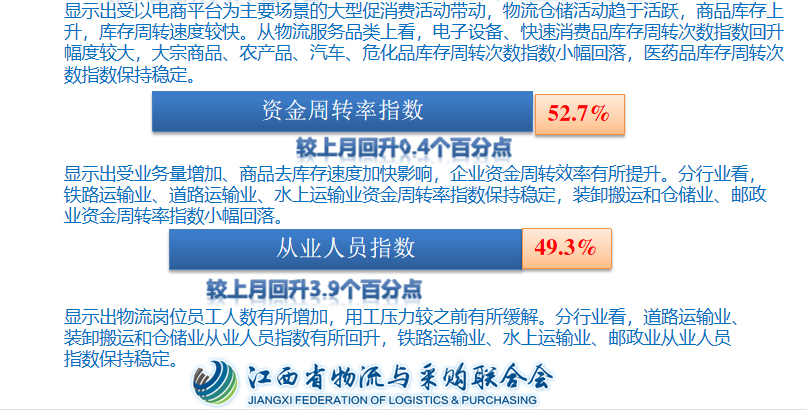 6月份,江西省物流业景气指数为51.4%,同比小幅回升0.6个百分点,显示出全省物流业务活动总体保持稳定增长的态势。从分项指数上看,反映需求的业务总量指数、新订单指数小幅回升;反映企业运营的库存周转次数指数、平均库存量指数、设备利用率等指数维持在较好水平;反映企业经营情况的资金周转率指数、主营业务利润和主营业务成本指数略有增长。