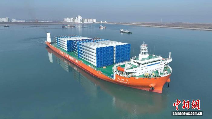 1月13日,在南通海事局的监管维护下,世界最大外贸甲板驳“泛洲7”轮装载132片风电叶片从南通启航,执行首次运输任务(无人机照片)。南通海事局 供图