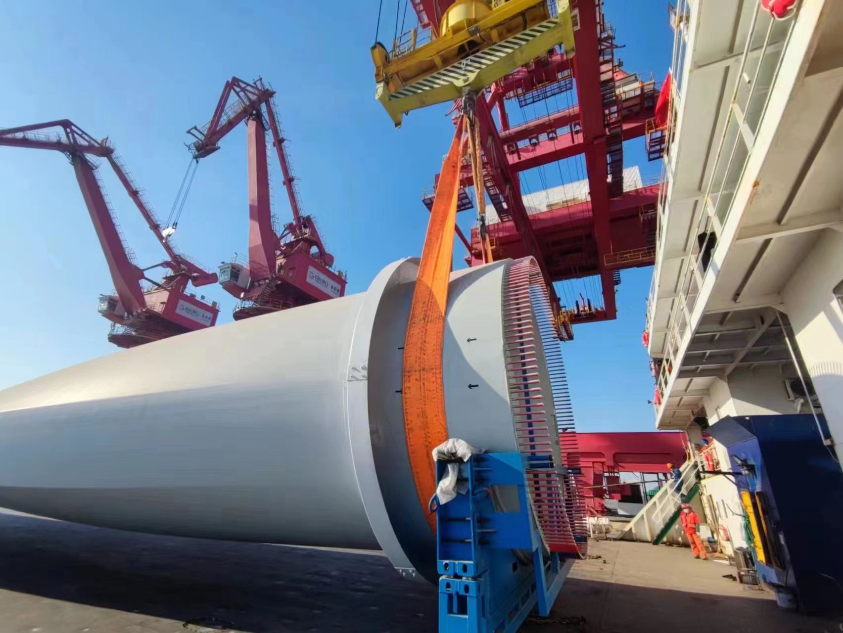 自风电叶片业务开展以来,山东港口东营港坚持“效率为先、安全第一”的原则,围绕叶片集港、港区内转运、吊装工艺优化、安全管控等方面综合发力,深挖提质增效潜能。截至目前,已累计集港风电叶片35支,装船发运24支,风电叶片单支装(卸)车时间缩减至1小时,单套(3支)全过程装船时间缩减至5小时。