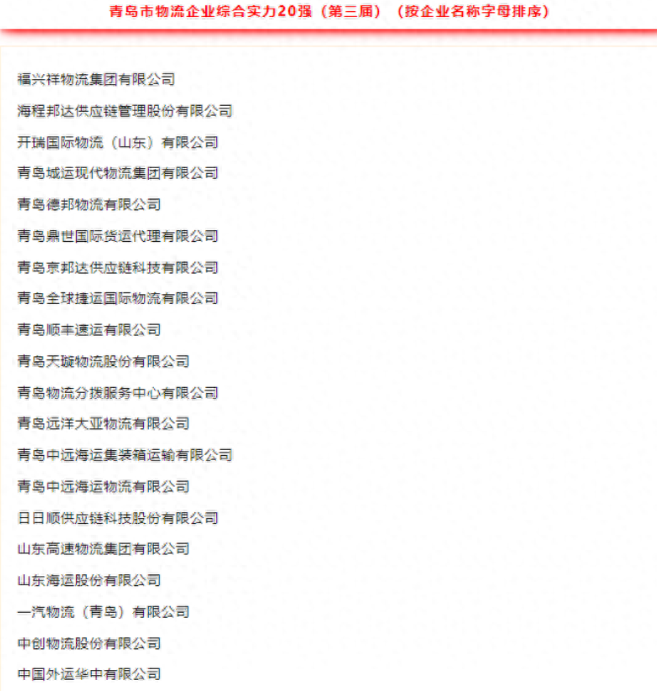 日前,在青岛市交通运输局、市发展改革委以及各区市物流主管部门的支持下,青岛市物流协会开展了青岛市物流企业综合实力20强(第三届)评选活动,通过物流营业收入、资产总额、纳税总额以及社会贡献度等多个指标维度给出了青岛物流前排企业的“画像”: