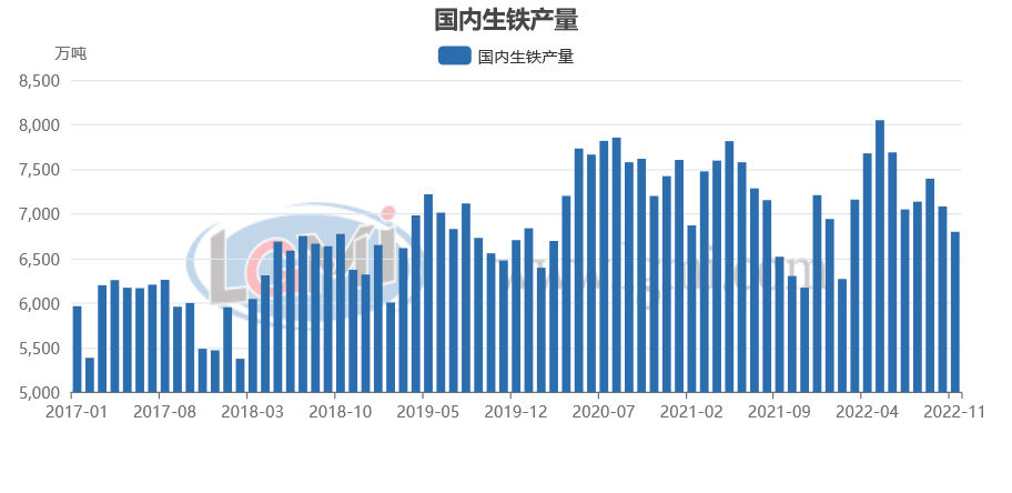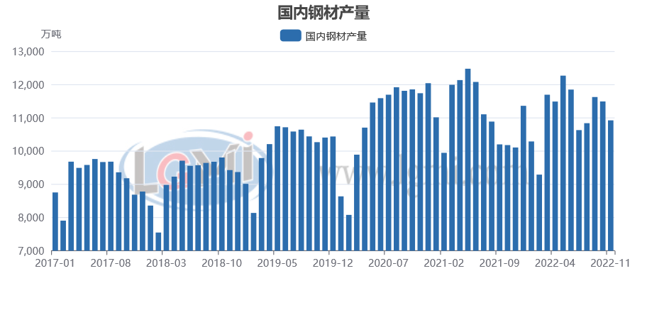 2022年11月份,受到原料成本相对坚挺以及赶工需求明显释放的带动,国内钢材市场呈现震荡反弹的行情,但随着冬季的不断深入,终端需求淡季效应逐步显现,同时钢厂也面临着成本端和需求端的双重挤压,钢厂亏损压力依然较大,从而也压制了钢厂的产能释放。据国家统计局数据显示,11月份,我国粗钢产量7454万吨,同比增长7.3%(详见图1);生铁产量6799万吨,同比增长9.7%(详见图2);钢材产量10919万吨,同比增长7.1%(详见图3)。1-11月,我国粗钢产量93511万吨,同比下降1.4%;生铁产量79506万吨,同比下降0.4%;钢材产量122553万吨,同比下降0.7%。