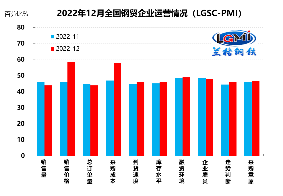 兰格钢铁网统计发布的2022年12月份钢铁流通业PMI总指数为47.2%,比上月回落0.7个百分点,在收缩区间内略有下滑。从分类指数看,构成钢铁流通业 PMI的10个分类指数7升3降,其中销售价格、采购成本、到货速度、库存水平、融资环境、走势判断和采购意愿7项指数上升,而销售量、总订单量和企业雇员3项下降。