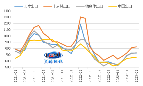 近两个月以来,海外和中国热卷出口价格持续上调,但因我国出口报价上调幅度相对较低,因而我国钢材出口价格优势逐步明显。兰格钢铁研究中心监测数据显示,截至2023年3月6日,印度、土耳其、独联体热轧卷板出口报价(FOB)分别为725美元/吨、825美元/吨和730美元/吨,中国热轧卷板出口报价(FOB)为660美元/吨,分别较去年底上涨125美元/吨、150美元/吨、130美元/吨及65美元/吨;目前我国热卷出口报价较印度、土耳其、独联体出口报价分别低65美元/吨、165美元/吨和70美元/吨。