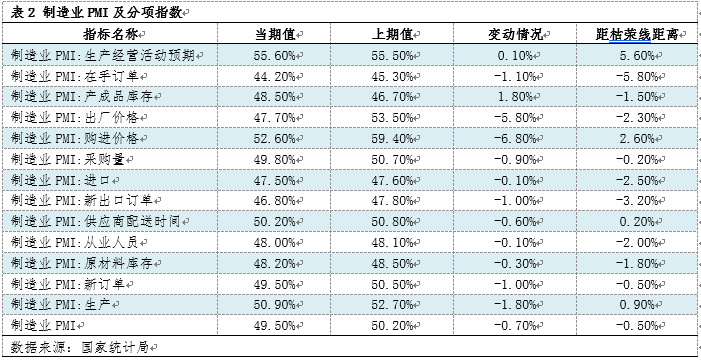 国家统计局服务业调查中心、中国物流与采购联合会发布数据显示,10月份,制造业采购经理指数(PMI)为49.5%,比上月下降0.7个百分点,再次跌到50%枯荣线的下方,钢铁下游需求仍存在较大的反复性。从分项指数来看,与上月相比,仅有生产经营活动预期以及产成品库存出现了一定幅度的上涨,其中产成品库存上涨较为明显,但仍处在50%的枯荣线下方,显示制造业仍处在去库存阶段,不过随着库存基数的不断下降,降库幅度有所收窄。其他分项指数来看,在手订单、新出口订单、新订单均出现了小幅的下滑,其中新订单指数更是降到50%枯荣线的下方,表明10月制造业的订单情况较9月再次出现了一定的下降,这对于后期钢铁需求的持续性产生利空的影响。值得注意的是生产指数虽有下降,但仍保持在50%枯荣线的上方,表明制造业的生产活动仍处在扩张区间,结合生产经营活动预期指数的增加来看,市场对于一系列刺激政策仍抱有偏乐观的态度,这也使得制造业对于钢铁的短期需求仍有一定保证。