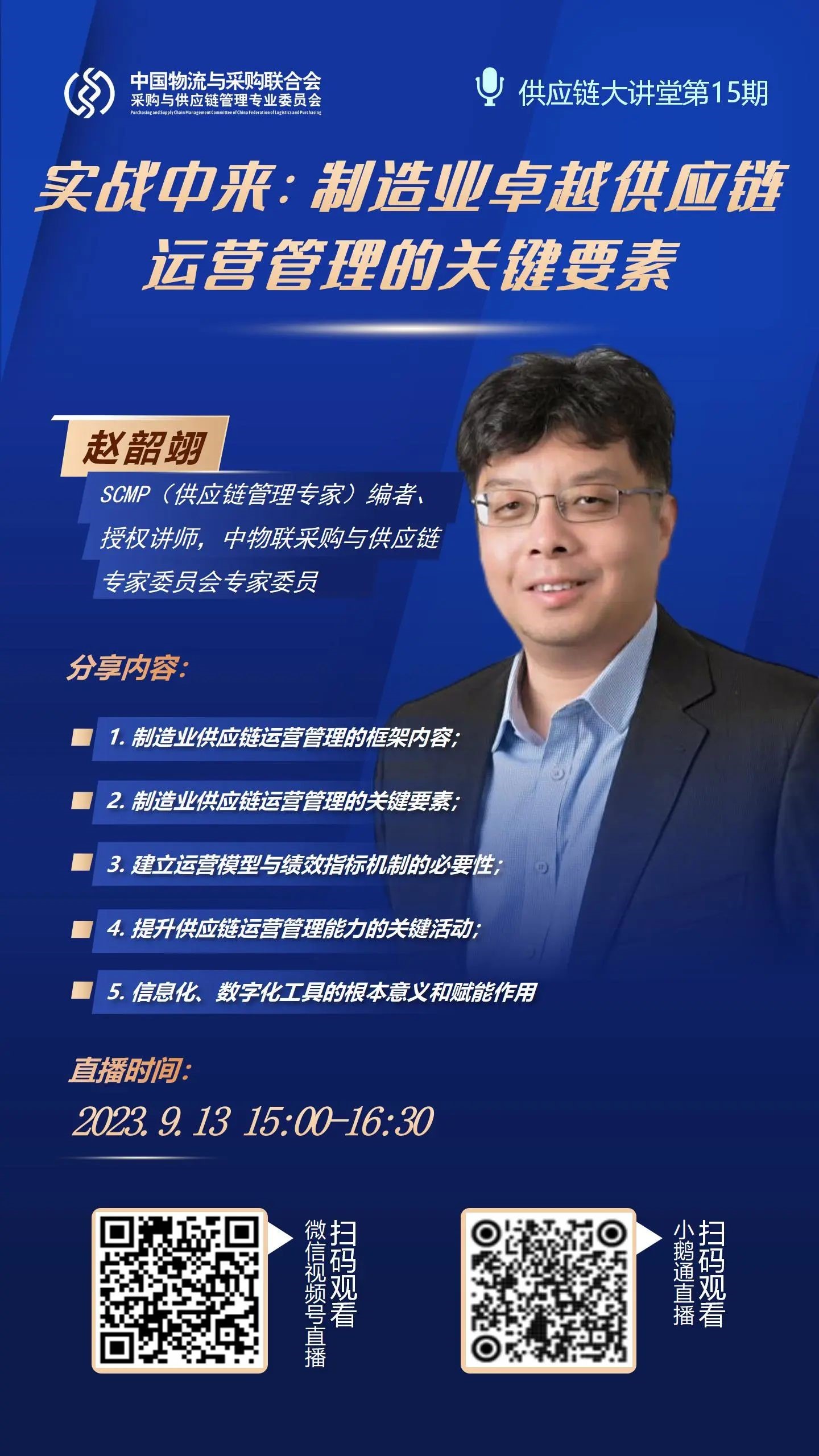 9月13日,由中国物流与采购联合会采购与供应链管理专业委员会主办的第十五期“供应链大讲堂”系列直播在线上举行。邀请“供应链管理专家”(SCMP)编者、授权讲师,中物联采购与供应链专家委员会委员赵韶翊,以“实战中来:制造业卓越供应链运营管理的关键要素”为题,围绕“制造业供应链运营管理的框架内容”“制造业供应链运营管理的关键要素”“建立运营模型与绩效指标的必要性”等内容进行讲解。