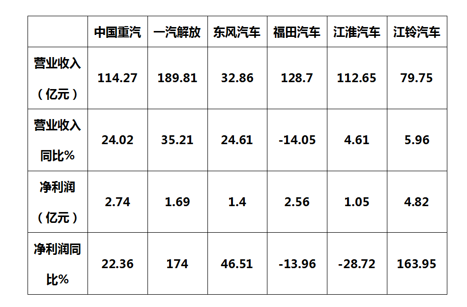 商用车领域沪深A股6家上市企业营业总收入达2523.3亿元,同比增长约31%;净利润45.9亿元,同比增长约1625%。其中5家企业实现净资产收益率增长。