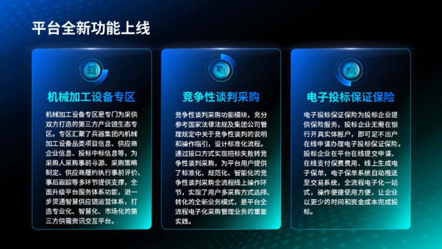 平台不断拓展增值服务,积极响应国家招投标领域优化营商环境的相关政策,上线投标保证保险服务。已累计为689家企业提供服务约1744次,有效降低投标单位流动资金占用近3.69亿元,电子投标保证保险功能线上应用初见成效。同时,打造机械加工专区、竞争性谈判等功能模块,为企业提供更加多样化、智能化、专业化的采购体验。
