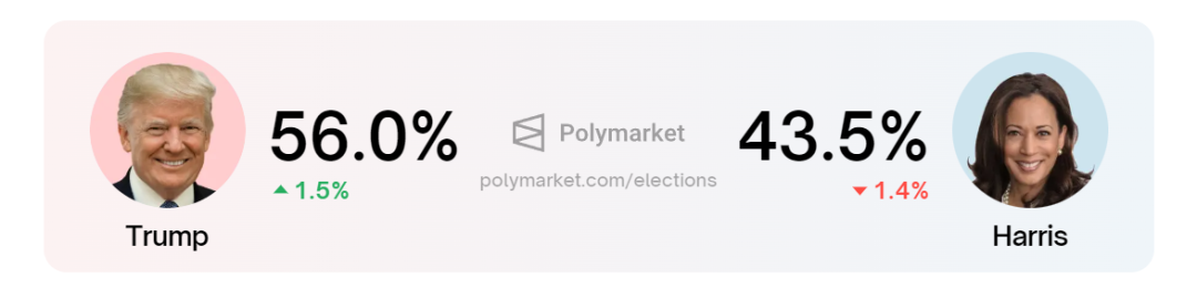 近日,知名市场预测平台Polymarket显示,特朗普赢得 2024 美国总统选举概率已反超哈里斯。截至10月11日下午,特朗普的胜选概率已经来到56.0%,而哈里斯胜选概率则降低至43.5%。