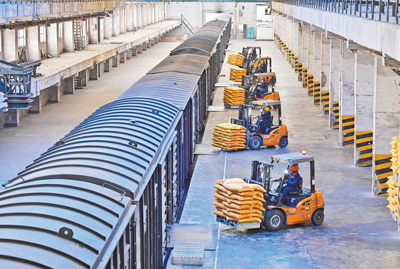 2月8日,工作人员在贵州省福泉市瓮福化工公司装运化肥。