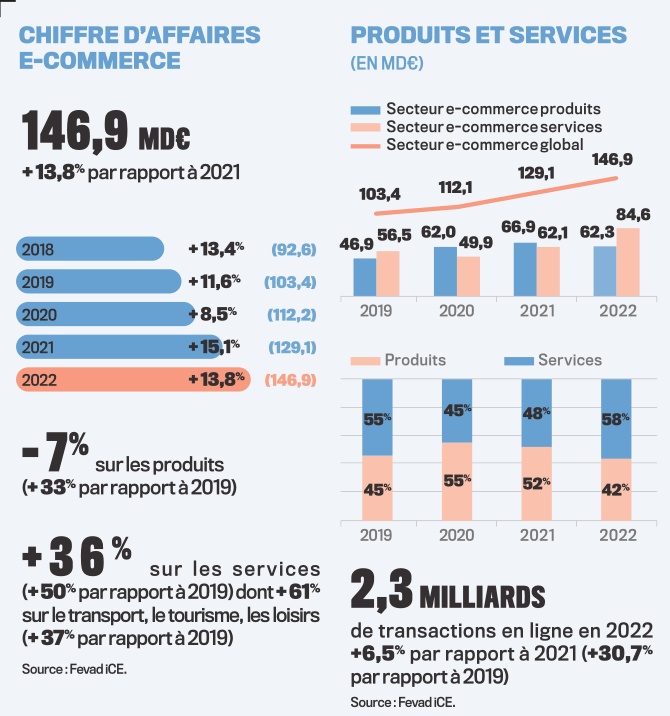 报告指出,电子商务已经成为法国经济的重要推动力。2022年,法国电商销售额达1500亿欧元,同比增长13.8%,在线销售占总零售额的12%。但这一增长主要由交通、旅游和休闲领域的在线销售增长推动,商品销售额有所下降,但比2019年增长了33%。
