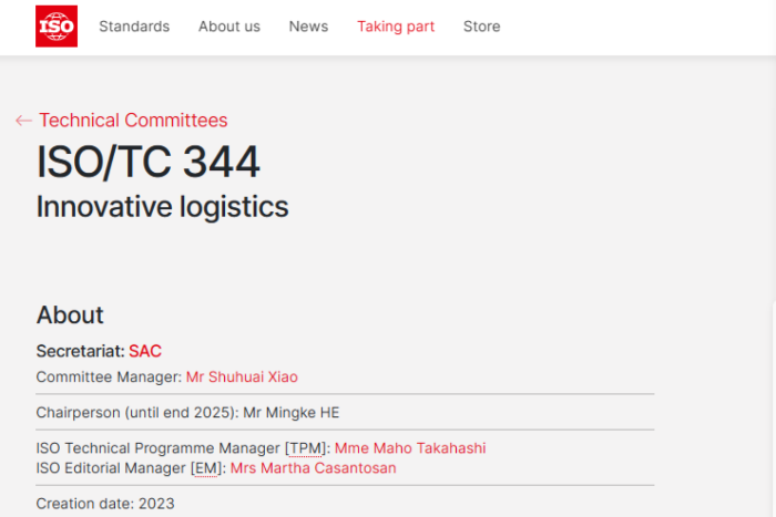 由中物联提交的ISO/TC(物流标准化技术委员会)提案申请,在市场监管总局标准创新司的组织与指导下,经过近三年的努力,于2023年6月由ISO正式批准成立(ISO第47/2023号决议),这是由中国承担的首个物流领域的国际标准化技术委员会,代表着我国在物流领域国际标准化方面取得了重大突破。