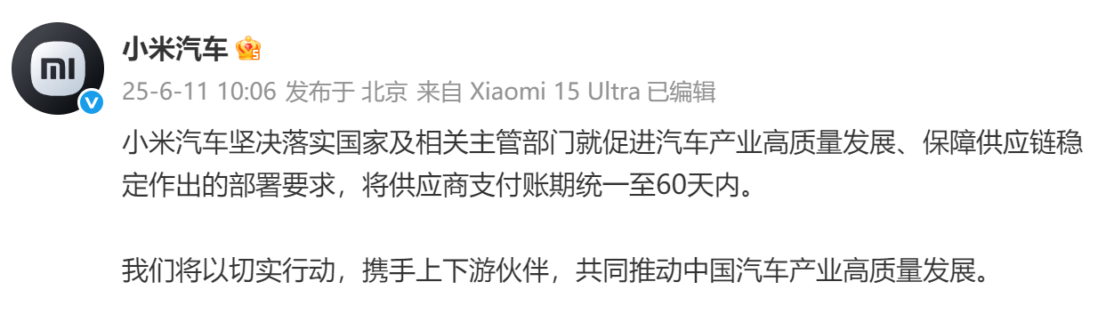 小米汽车坚决落实国家及相关主管部门就促进汽车产业高质量发展、保障供应链稳定作出的部署要求,将供应商支付账期统一至60天内。