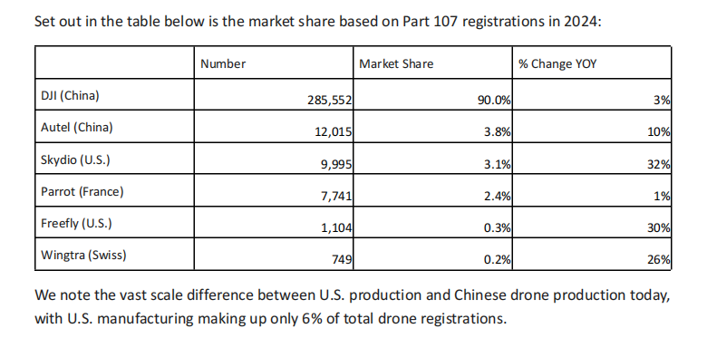 另据美国一家无人机行业联盟——美国无人机数据保护联盟(American Drone Data Protection Coalition,简称ADDPC)2025年8月向美国商务部工业和安全局(BIS)提交的一份意见,2024年,在美国注册无人机中,大疆的市场份额高达90%。