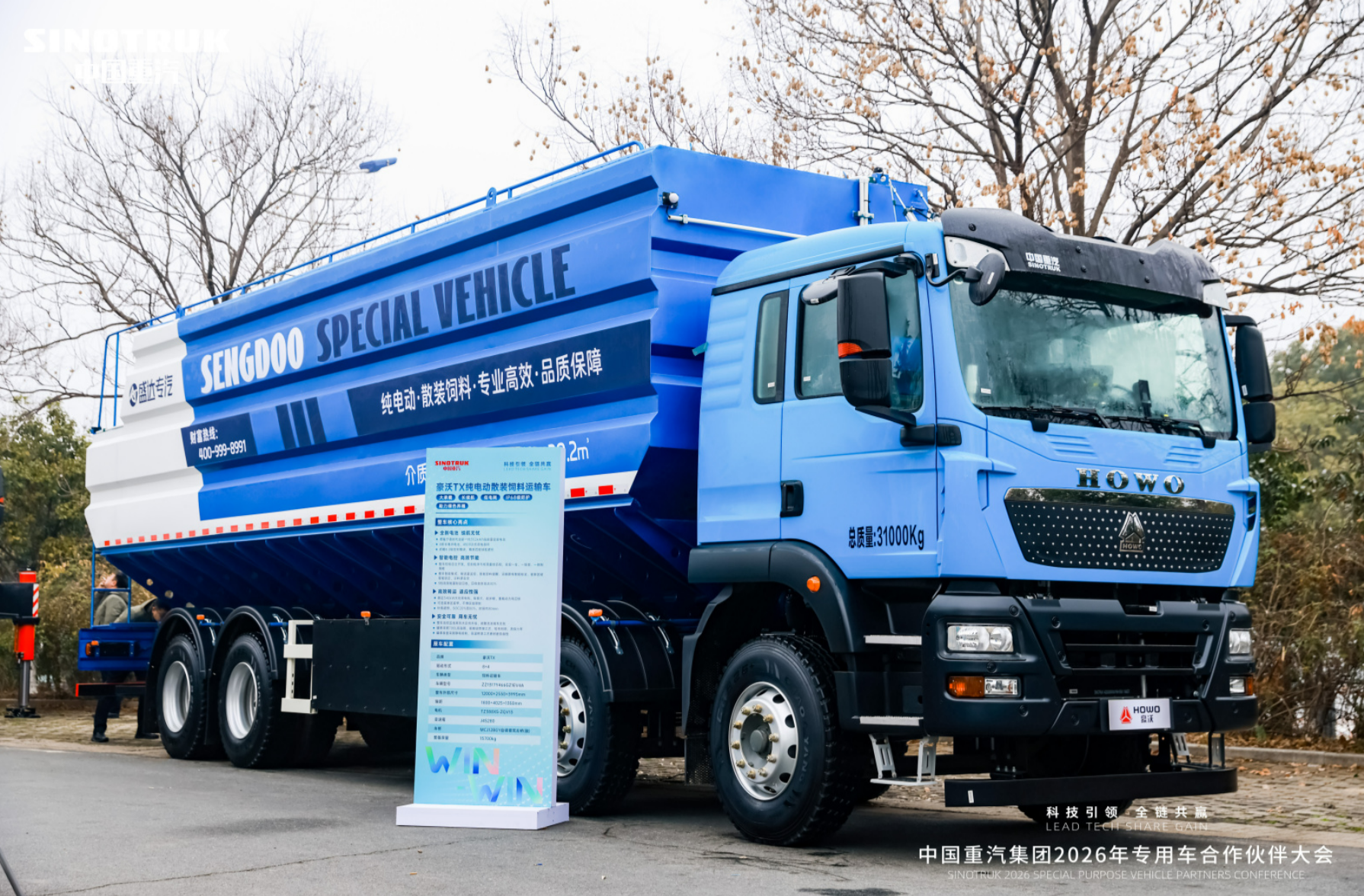在农牧运输领域,效率与可靠同样关键。豪沃TX纯电动散装饲料运输依托中国重汽自主开发的整车控制系统,实现“一车、一场景、一控制”的精准匹配策略,让车辆在不同路况与载荷下均能保持最佳运行状态;同时配备额定340kW大功率电机,扭矩大、起步稳,重载动力响应快,还可选装寒区装甲,不惧区域环境限制,保障饲料运输全程不断链。