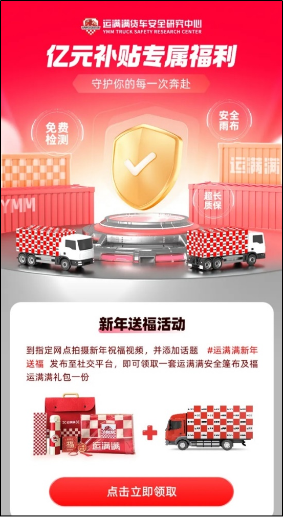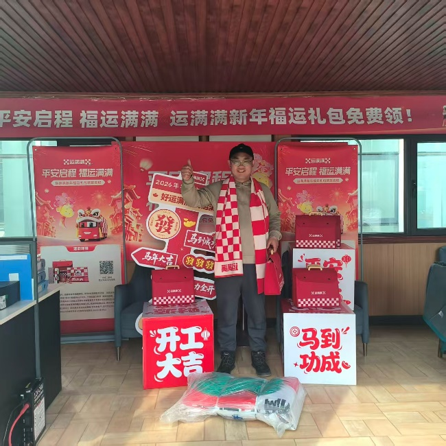 本次“平安启程 福运满满”活动自2026年2月25日正式启动,将持续至3月15日,覆盖全国12座物流枢纽城市——昆明、沈阳、郑州、长沙、南昌、哈尔滨、合肥等均设有线下活动网点,方便货车司机就近参与。活动参与方式简单便捷:司机师傅只需前往指定线下网点,拍摄新年祝福视频并带上 #运满满新年送福 话题发布至社交平台,即可免费领取限量版“福运满满” 开工礼包。礼包内不仅包含围巾、保温杯等暖心好物,更有平台专属定制的安全篷布。