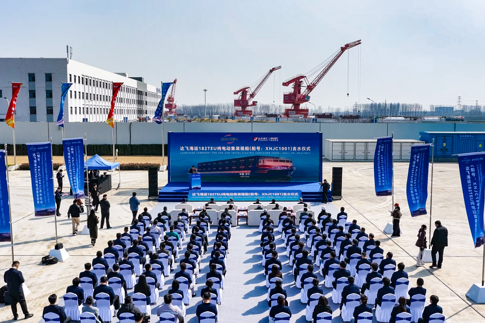 3月16日,由山东融汇集团权属山东新能船业有限公司(以下简称“新能船业”)为法国达飞海运集团建造的182TEU纯电动力集装箱运输船成功吉水。中国制造纯电动力内河集装箱运输船首次出海,山东融汇集团以“绿色智造”之姿,强势叩开国际船舶制造市场的大门。