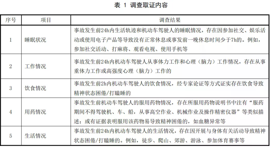 3.对机动车驾驶人驾驶车辆出发前睡眠状况和工作、饮食、用药、生活等情况进行调查,证实存在表1列举的一项或多项调查结果的。