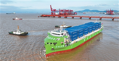 东海之滨,海天一色。4月15日16时,浙江宁波舟山港北仑第一集装箱码头公司7号泊位,一艘印有“宁远电鲲”字样的集装箱货轮缓缓驶离,驶向浙江嘉兴港乍浦港区。