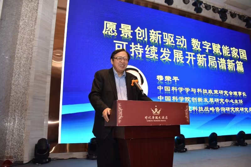 图为中国科学学与科技政策研究会理事长穆荣平,作《愿景创新驱动数字赋能家国可持续发展开新局谱新篇》演讲时。
