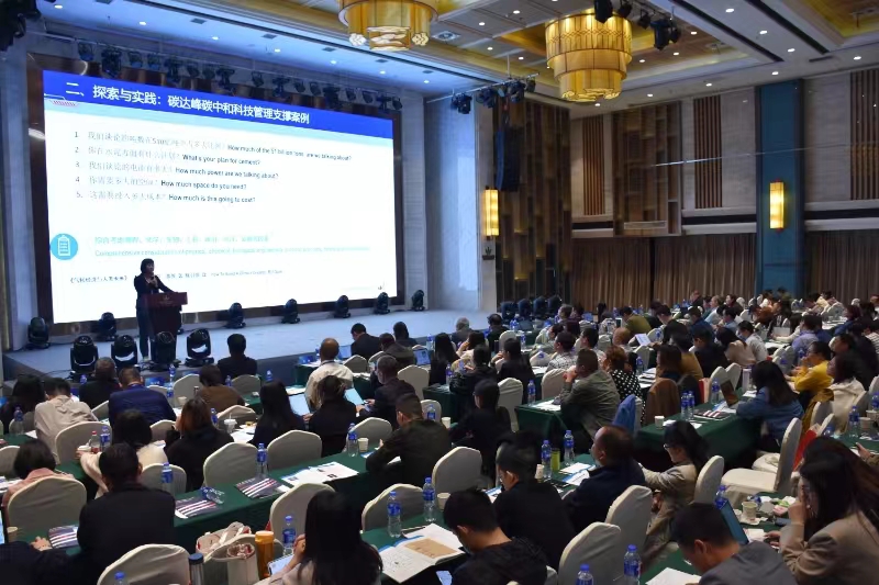 图为中国科学技术信息研究所区域创新发展研究中心主任,研究员郑佳,作《前沿科技热点领域发展态势研究》演讲场景。