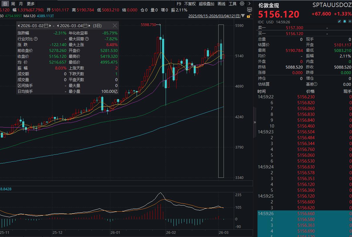 Wind显示,2月28日以来,国际金价震荡。3月3日,伦敦金现一度跌破5000美元/盎司,下探至4995.475美元/盎司;COMEX黄金盘中重挫,触及5005美元/盎司。3月4日,伦敦金现、COMEX黄金小幅回升,截至发稿重回5100美元上方。