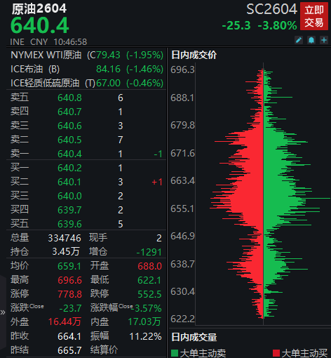 具体来看,截至发稿,上期所原油期货主力合约跌3.8%,报640.4元/桶;集运指数(欧线)主力合约跌7.31%,报1835.2点。