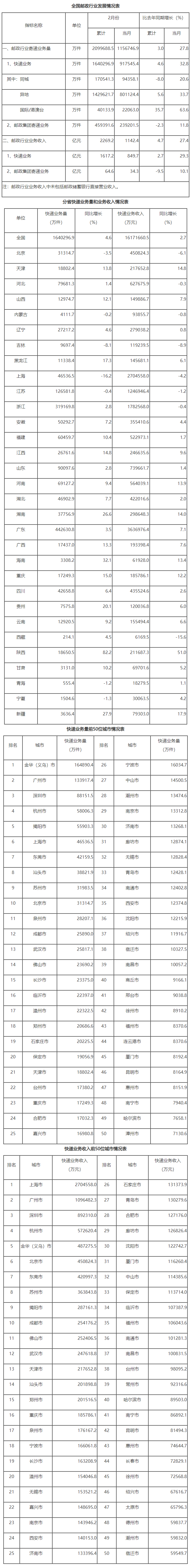 2月份,邮政行业业务收入(不包括邮政储蓄银行直接营业收入)完成1142.4亿元,同比增长27.4%。其中,快递业务收入完成849.7亿元,同比增长29.3%;邮政集团寄递业务收入完成34.3亿元,同比增长10.1%。