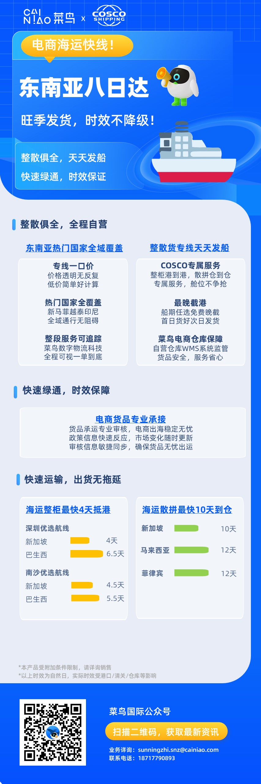 10月19日,菜鸟国际与华南中远海运集运宣布共同开通东南亚八日达电商海运快线。双方整合各自优势资源,携手打造由蛇口、南沙港至马来西亚巴生、新加坡港的整柜和散拼端到端全链路服务。