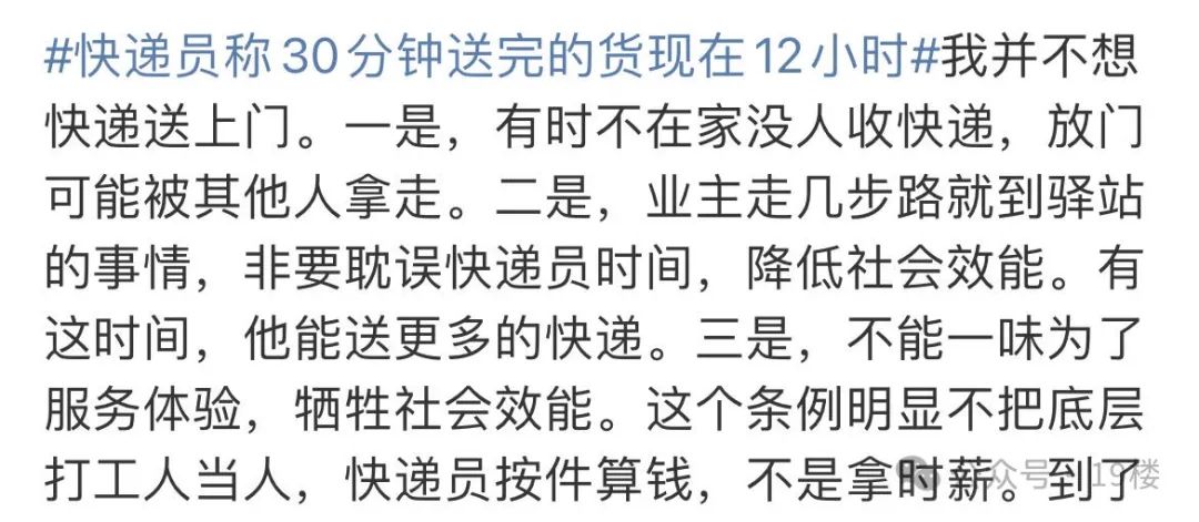 新规实施后,有快递小哥发视频吐槽,以前30分钟送完的快递,现在要从早上9点干到晚上9点,整整12个小时,但收入只增加了60元。