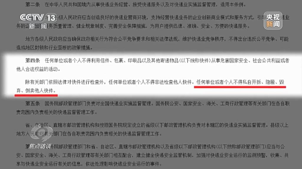 国务院颁布的《快递暂行条例》第四条明确规定,“任何单位或者个人不得私自开拆、隐匿、毁弃、倒卖他人快件。”