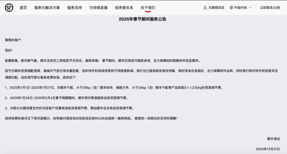 2025年1月28日-2025年2月4日春节假期期间,顺丰将对寄递服务加收资源调节费。
