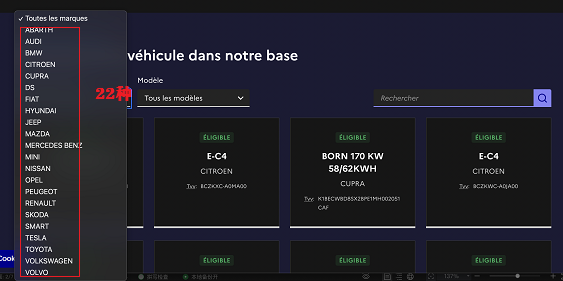 第一财经记者查阅法国政府相关网站,看到了“电动汽车补贴”名单上总共有约22个电动汽车品牌,包括雪铁龙、标致和雷诺等主要法国制造商,以及宝马、菲亚特、奔驰、Smart、大众等欧洲品牌,奥迪的Q4 45 E-Tron、宝马的iX1、宝马的iX2和雪铁龙的E-C4等车型都在补贴清单上,有78种车型。与之相比,现代只有1款汽车进入名单,日本的尼桑和丰田进入名单的车型则多一些。