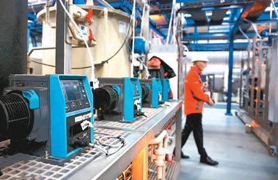 2023年11月14日,在法国特拉普一家电动汽车电池回收工厂,一名工程师走过电池回收装置。新华社/路透