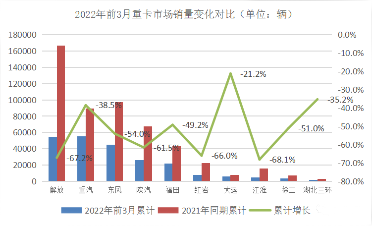 2022年的重卡市场,在“凛冬将至”的预言中艰难起跑,受全球经济下行、俄乌冲突升级、国内疫情多点散发、燃油价格持续飙升以及车多货少等不利因素叠加影响,一季度国内重卡累计销量为23.2万辆,同比去年的53.1万辆,下降了56.3%。