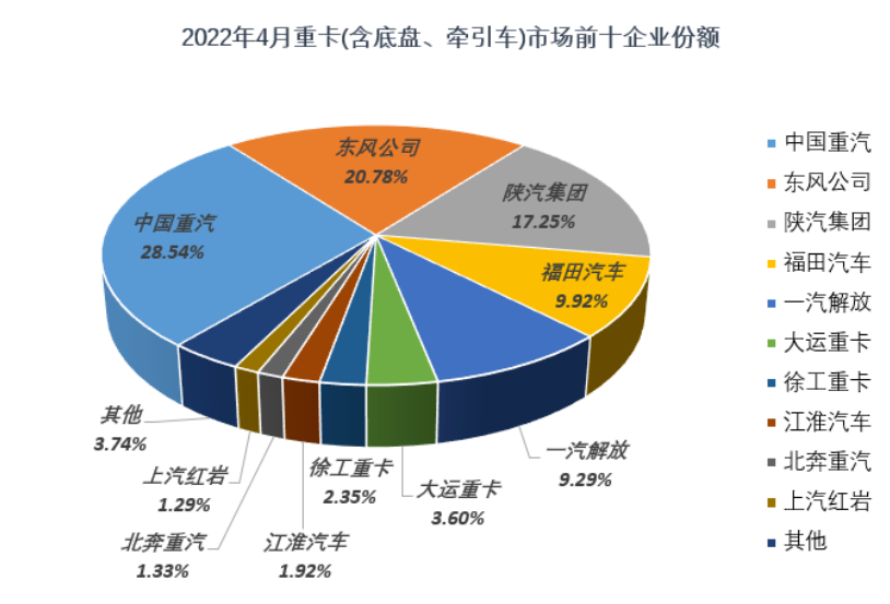 在行业“凛冬”中,4月排名前五的重卡企业中,中国重汽是唯一实现销量破万的企业,以1.25万辆的销量,拿下2022年以来的第二个月度销冠,前4月,达成“2冠2亚”、“一季度冠军”的成绩,累计销售6.76万辆,实现销量登顶,市占率上升至28.54%,进一步稳固了行业“老大”的地位,在行业洗牌中实现腾飞。