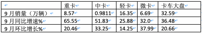 一是今年9月卡车市场中的重卡、中卡、微卡同环比增速均跑赢卡车大盘,从而推高了卡车大盘的他环比增速;