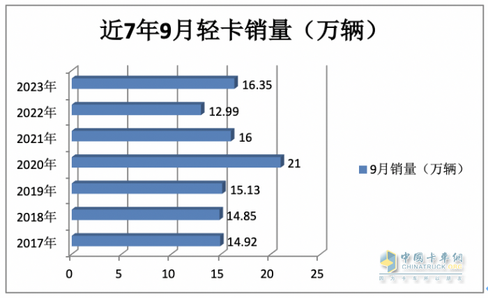 上图可见,2023年9月轻卡销量16.35万辆,在近7年同期中居于第二高,处于较高水平,也超过了疫情之前的2019年9月份的15.13万辆销量近1.22万辆。